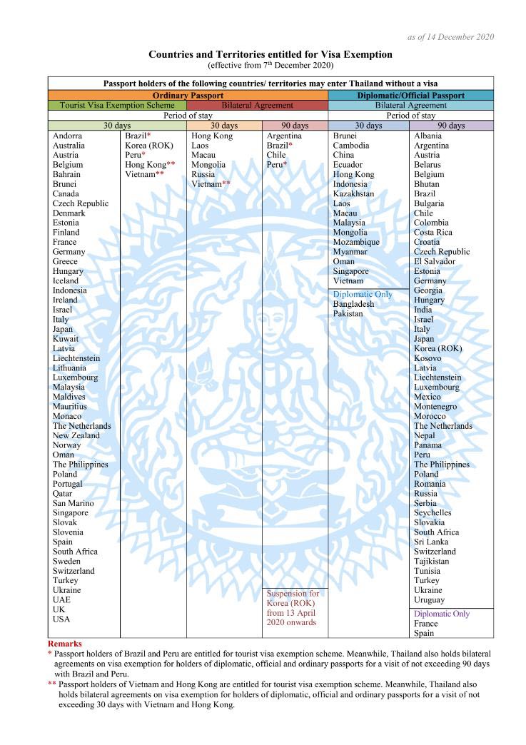 Tourist Visas Tourists from many countries (including the US, UK, Germany, France and Singapore) do not require a visa when entering Thailand and can stay for a duration of 30-days. In many of these countries (including the US, UK, Australia, Germany, France and Singapore) you can apply for a 60-day tourist visa before you leave. If you hold a Brazilian, Peruvian or South Korean passport, you are exempted from visa requirements and are permitted to enter and stay in Thailand for a period of not exceeding 90 days. Citizens of some other countries are required to apply for a 15-day visa at immigration checkpoints on arrival, while others must apply for one before they leave. It all depends on the particular visa arrangement Thailand has with your home country. The best way to find out is to check with either the Thai Immigration Bureau or the Thai Embassy or Consulate in your home country. Coming to Thailand for business is a whole different story. Check out the Legalities section of our Business Essentials Guide for information about the visas necessary for those looking to work or gain employment here.